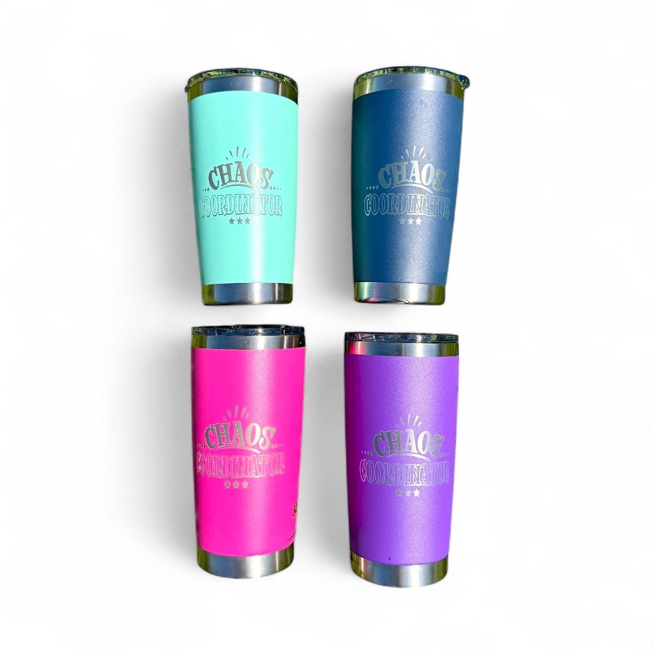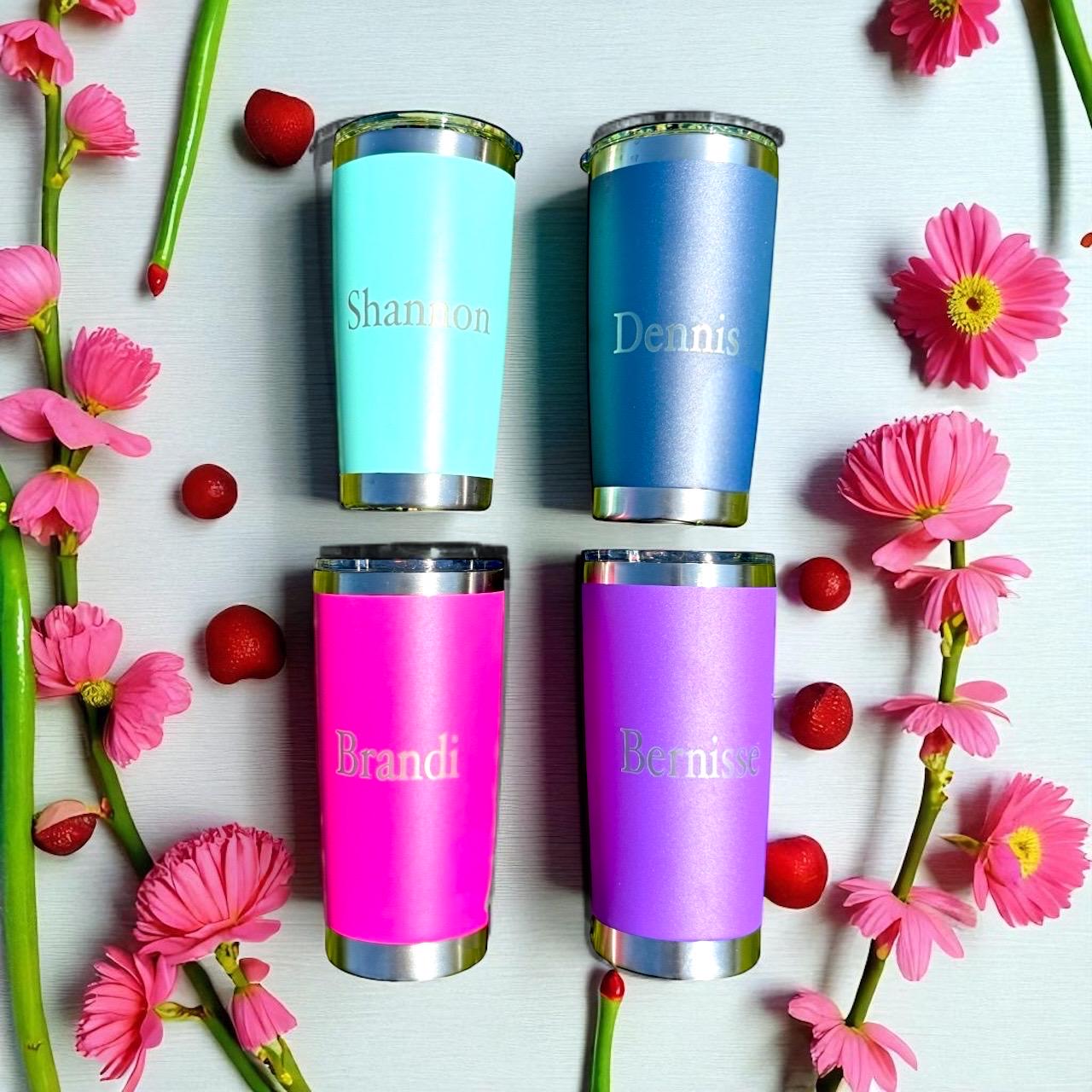 These double wall stainless tumblers are sturdy and dishwasher, safe custom engraved with design of your choice, or choose from one of our premade designs.